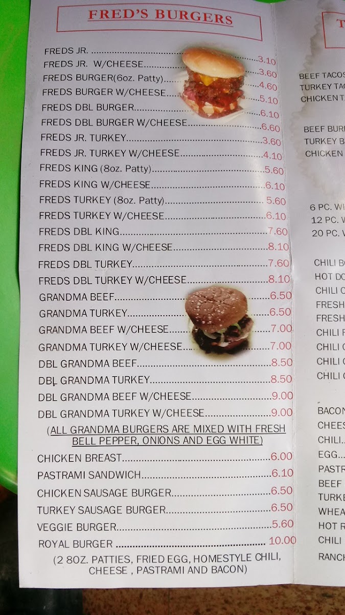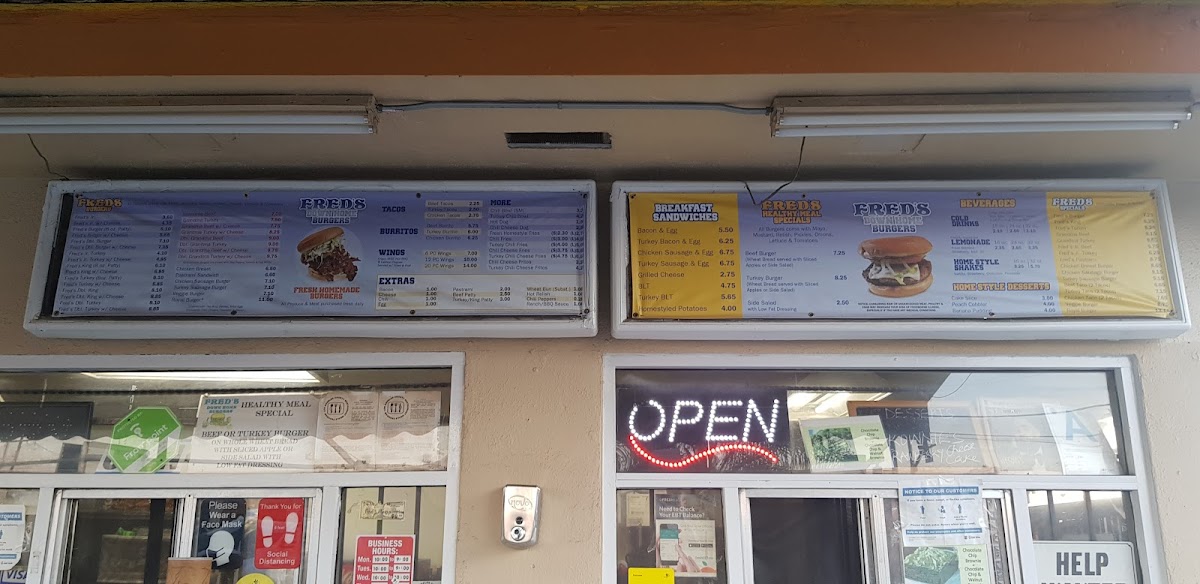 Fred's Downhome Burgers Menu